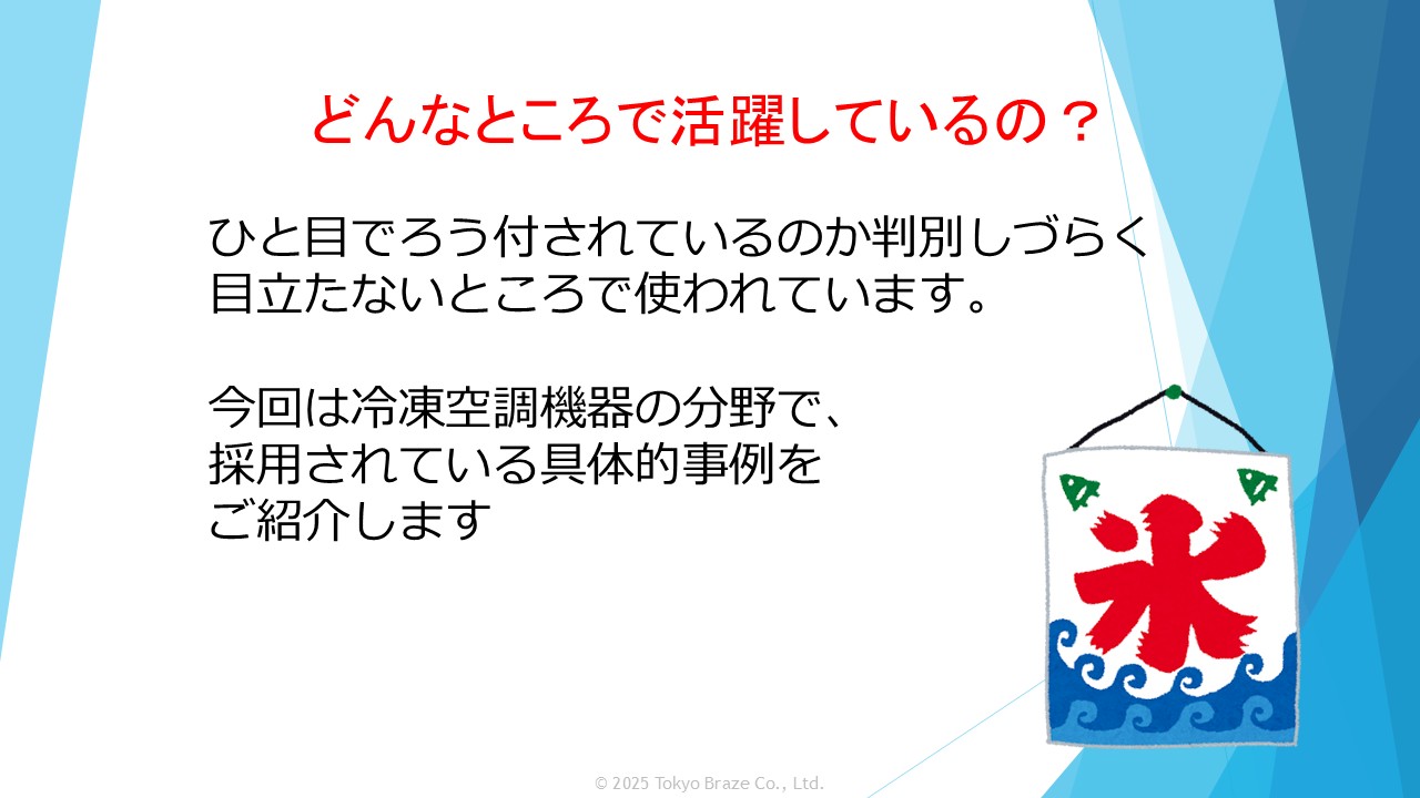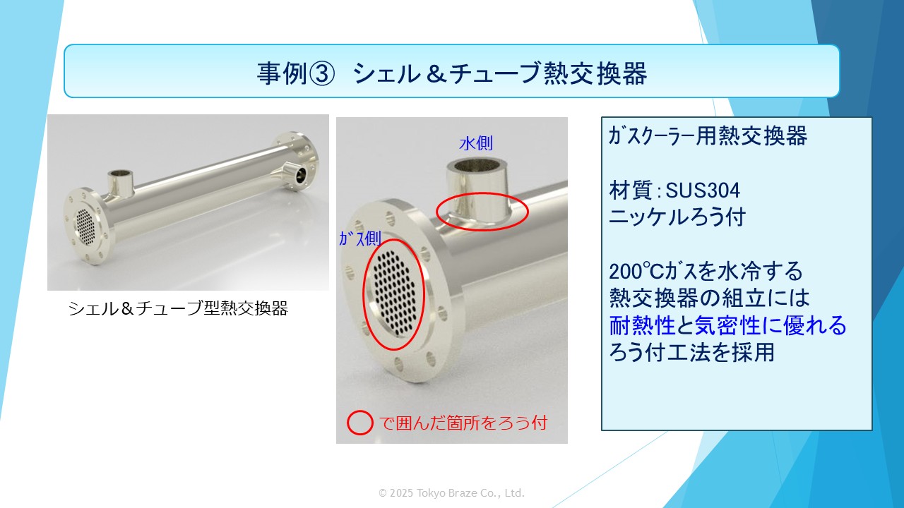 ロウ付工法で製作された製品を紹介しています。冷媒配管や、冷凍機バルブ、熱交換器などの事例を紹介しています。