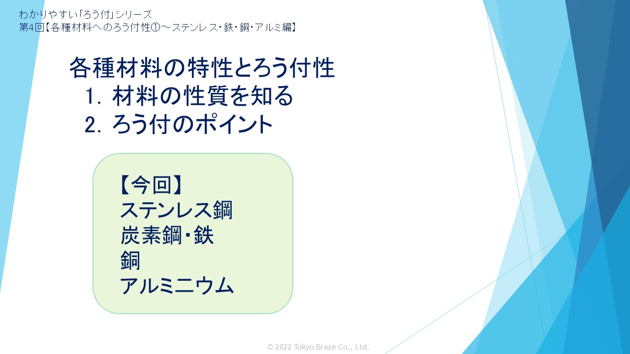 材料の性質についてと、それぞれのロウ付ポイントを解説します。