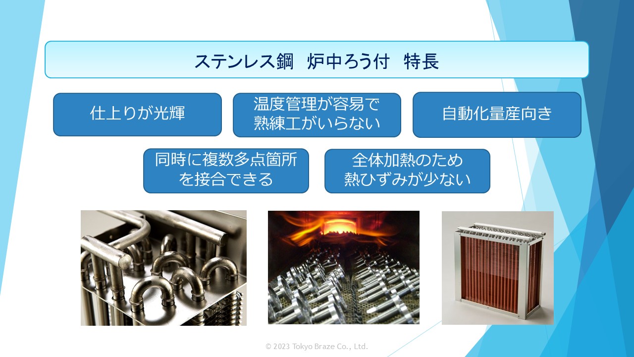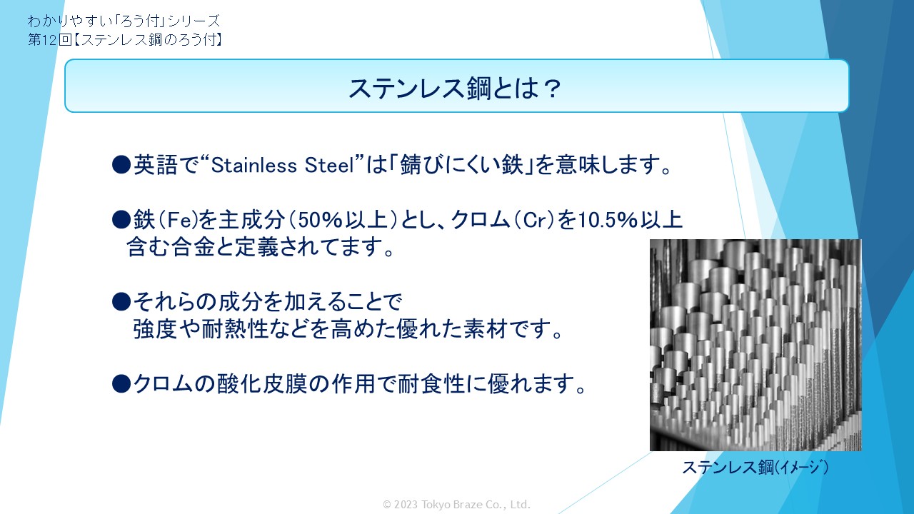 ステンレス鋼の特長と種類を解説し、ロウ付に使用される主なロウ材と、加熱方法などを解説します。