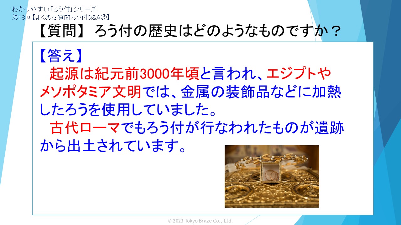 ロウ付の起源や。ロウ付が活躍する分野などにフォーカスして解説しています。
