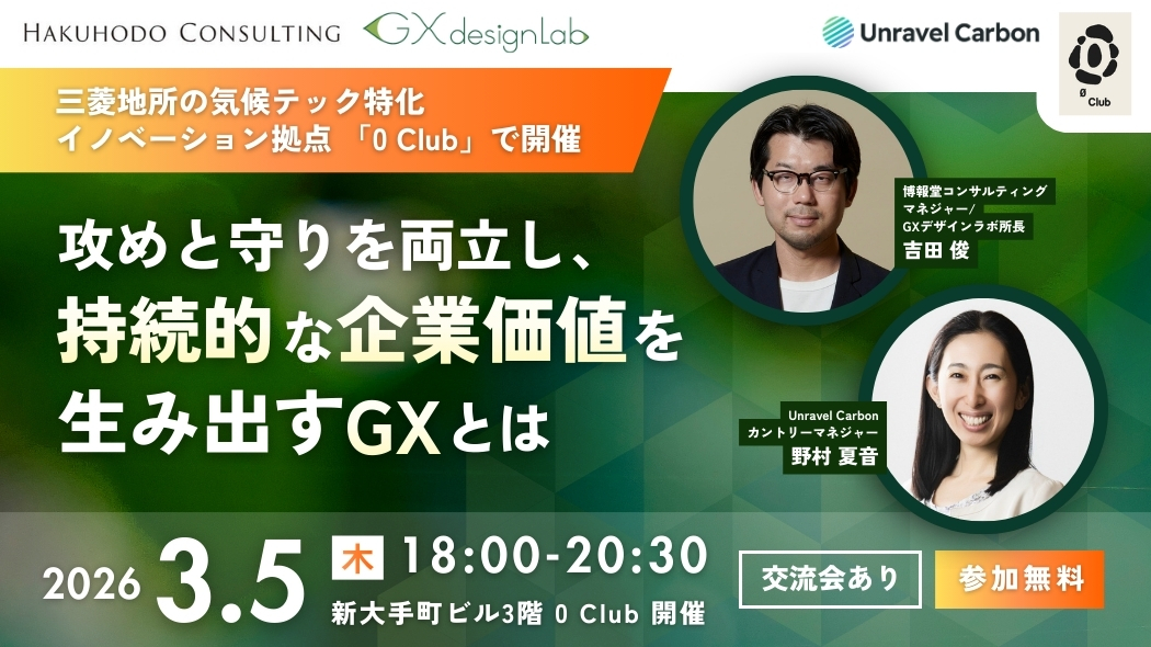 株式会社博報堂コンサルティング(以下 当社)は、個人情報の重要性を認識し、保護の徹底に努めております。ご登録いただきましたお客様の個人情報は、本セミナーに関する申込受付、確認・連絡、運営上の管理、および当社からのニュースレターや各種情報のご提供に利用させていただきます。当社は、次の方針のもとで個人情報を取り扱います。1. 事業者の名称株式会社博報堂コンサルティング2. 個人情報の管理体制当社は、下記の者を個人情報管理責任者として任命し、適切な個人情報の管理体制を整備いたします。個人情報管理責任者:代表取締役社長 土屋 亮3. 個人情報の利用目的当社は、取得した個人情報を以下の目的の範囲内で利用いたします。(1) セミナー申込受付および運営上の諸連絡、受発注業務、請求・支払業務のため(2) 当社ならびに当社の関連企業および共催企業から、皆様に有益と考えられる情報(ニュースレターの配信、セミナー・イベント・刊行物・サービス等のご案内)をお届けするため(3) その他、一般事務の連絡、お問い合わせ対応および回答のため4. 個人情報の第三者提供および共同利用当社は、次に掲げる場合を除き、お客様の個人情報を第三者に提供することはございません。(1) ご本人の同意がある場合当社は、本セミナーの運営および関連情報のご案内を目的として、ご本人の同意を前提に、以下の企業に対し、必要な範囲で個人情報を提供することがあります。・博報堂DYグループ各社など当社の関連企業・Unravel Carbon 合同会社(本セミナー共催者)・三菱地所株式会社(本セミナー共催者)提供する個人情報の項目:氏名、会社名、部署名、役職、メールアドレス、電話番号、その他セミナー申込時にご入力いただいた情報提供の方法:電子データの送信または当社が指定する安全な方法による共有提供後の利用目的:セミナー運営、関連サービス・イベント・情報提供のご案内のため(2) 法令に基づく場合(3) 人の生命、身体または財産の保護のために必要がある場合であって、ご本人の同意を得ることが困難な場合(4) 公衆衛生の向上または児童の健全な育成の推進のために特に必要がある場合であって、ご本人の同意を得ることが困難な場合(5) 国の機関または地方公共団体等への協力が必要な場合(6) 利用目的の達成に必要な範囲内で業務委託を行う場合なお、お客様は、当社に対し、上記の第三者提供の停止を求めることができます。5. 個人情報取扱いの委託当社は、利用目的の達成に必要な範囲内において、個人情報の取り扱いの全部または一部を外部に委託する場合があります。この場合、適切な管理水準を満たす委託先を選定し、契約等により適切な管理を義務付けます。6. 個人情報の開示等の請求お客様は、当社に対して、ご自身の個人情報について、利用目的の通知、開示、訂正・追加・削除、利用停止、消去、第三者提供の停止を求めることができます。ご希望の場合は、当社お問い合わせ窓口までご連絡ください。ご本人確認のうえ、合理的な期間内に対応いたします。7. 個人情報提供の任意性お客様が当社に個人情報を提供されるかどうかは任意です。ただし、必要な項目をご提供いただけない場合、本セミナーおよび関連サービス等を適切に提供できない場合があります。