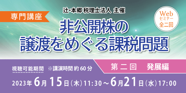 非公開株式の発行法人への譲渡、第三者間取引、高額譲渡、譲渡損の扱い、みなし贈与課税など非公開株式の譲渡に伴い発生する課税問題について、実務における対応などをわかりやすく解説します。 ※この申し込みページは第二回の申し込みです。 第一回の申し込みページはこちら。 |