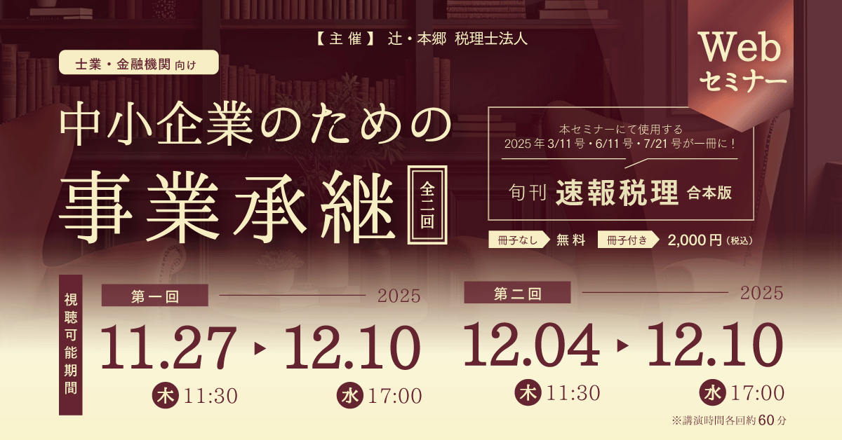 | プログラム | 講演時間【各回約60分】※収録動画のご視聴 【第一回 基礎編】 ◆事業承継の傾向 ◆親族内承継 ◆親族外(社内)承継 【第二回 応用編】 ◆第三者承継(M&A) ◆経営の見える化・磨き上げ 税理士、会計士、金融機関をはじめとする事業承継の相談対応をされる方々を対象に、中小企業の事業承継について専門家が詳しく解説する全二回のセミナーです。 本セミナーは『旬刊速報税理 中小企業のための事業承継』をテキストとし、わかりやすくお伝えします。 第一回の基礎編では、事業承継を進める上での基礎知識を含め、親族内承継や社内承継といった主に内部での承継について解説します。第二回の応用編では、近年増加傾向が顕著な第三者承継(M&A)について深く掘り下げます。特に昨今問題となっているM&Aアドバイザーとのトラブル回避策や、企業価値を高めるM&Aの進め方、これから会社譲渡を検討するオーナーにとって重要となる経営の見える化や磨き上げについて説明します。 実践的な知識習得のためのセミナーとして、是非お役立てください。 ※有料で小冊子『旬刊速報税理 中小企業のための事業承継シリーズ』(辻・本郷 税理士法人編著:株式会社ぎょうせい発行)付きのお申し込みも可能です。 小冊子付(2,000円/税込)のお申し込みはこちら。 |