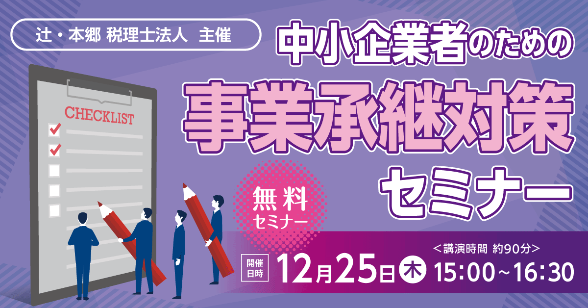 | 備考 | ・事前申込制の、会場来場セミナーとなります。(講演時間は約60分、質疑応答30分) ・定員に達した場合、お申込期間終了前に締め切る場合があります。 ・お申し込みいただいた方へは、開催日が近くなりましたら、詳細を記載した当日のご案内メールをお送りします。 ・お申込フォームに入力いただいた情報は、今後のサービス提供のため、辻・本郷 税理士法人で利用させていただきます。同意の上、お申し込みくださいますようお願いします。 ・本セミナーは、一般企業(事業会社)の経営者様、後継者様を主な対象としております。 つきましては、大変恐縮ではございますが、同業他社様、コンサルティング会社様のご参加はご遠慮いただいております。 |