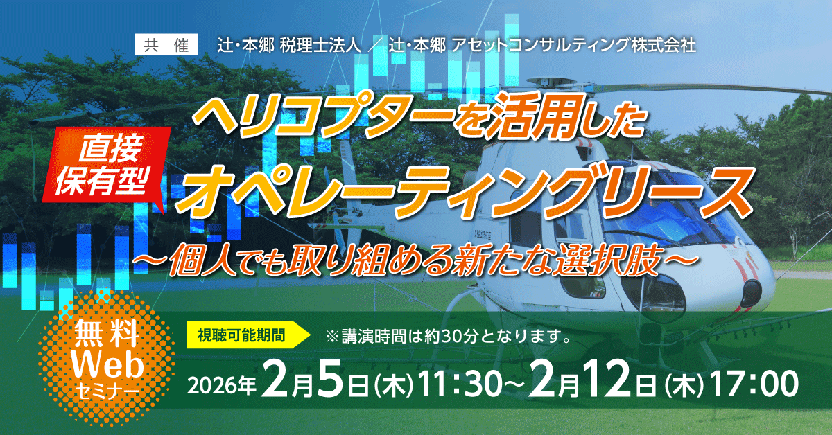 | プログラム | 講演時間【約30分】※収録動画のご視聴 ◆直接保有型のオペレーティングリースとは ◆個人と法人での税務効果の違い ◆なぜヘリコプターなのか ◆知っておくべきリスクと考え方 ヘリコプターを活用した「直接保有型オペレーティングリース」は、個人・法人を問わず減価償却メリットを享受でき、キャッシュフロー改善や資産防衛策として注目を集めています。 最大の特徴は、従来の航空機リース(匿名組合型)では参入が難しかった個人投資家でも取り組みやすい点です。また、対象となるヘリコプターは医療・防災といった社会インフラ需要が底堅く、出口戦略が描きやすいことも大きな魅力です。 本セミナーでは、具体的なスキームから、個人・法人それぞれの税務効果、市場動向、そしてリスクと対処法について、専門家が詳しく解説します。 ※本セミナーは情報提供を目的とするものであり、投資の勧誘を目的としたものではありません。 |