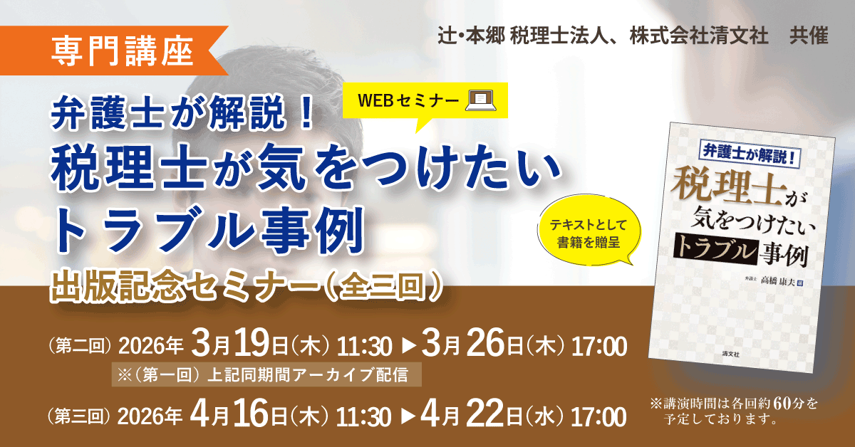 | 備考 | 事前に収録した動画をご視聴いただきます(講演時間は各回約60分となります)。 お申し込みいただいた方に、請求書と「お振り込みのご案内」をご登録いただいたメールアドレスへ送付いたします。 受講方法等を記載したご案内メールは、各視聴期間初日にお送りいたします。 本セミナーは辻・本郷 税理士法人、株式会社清文社の共同開催です。 つきましては今後のサービス提供のため、お申込フォームに入力いただいた情報は2社共同で利用させていただきます。 同意の上、お申し込みくださいますようお願いします。 ※会計事務所向けサービス「実トレ for 会計事務所」(月額2,200円/1名様)会員の方は、実トレ for 会計事務所内の「セミナー動画」にて無料でご視聴いただけます。(※書籍の贈呈はございません) 会計事務所の方は、ぜひ実トレ for 会計事務所にご登録ください。 |