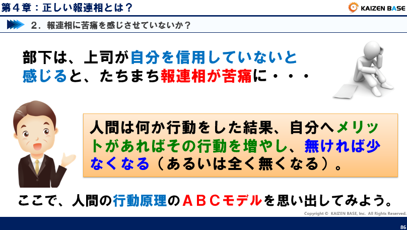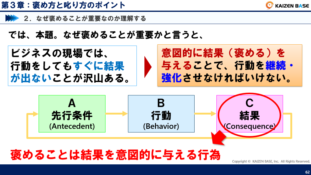 ビジネスの現場では、行動をしてもすぐに結果が出ないことが沢山あります。行動分析学における人間の行動原理のABCモデルでいう、結果 Cがすぐに与えられないことが多いのです。 従って、行動を継続させ強化させるためには、意図的に結果を与えることが必要になります。つまり、部下の行動を継続させるためにも、褒めることにより結果を意図的に与えなければならないのです。これが褒めることが重要である理由となります。