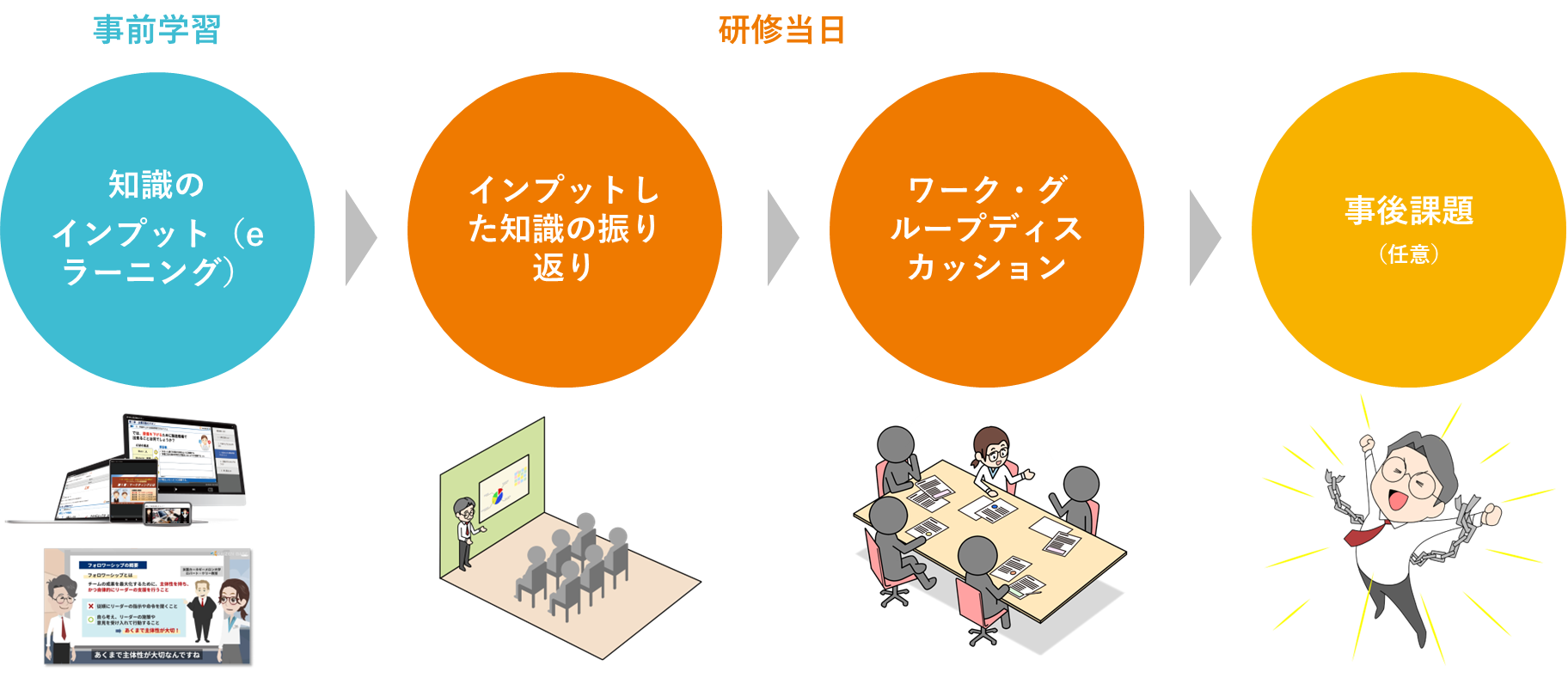 基本知識はeラーニングで事前にインプットすることで、研修当日はワークショップなどの実践的な内容に集中することができるのが、カイゼンベースの研修の強みです。