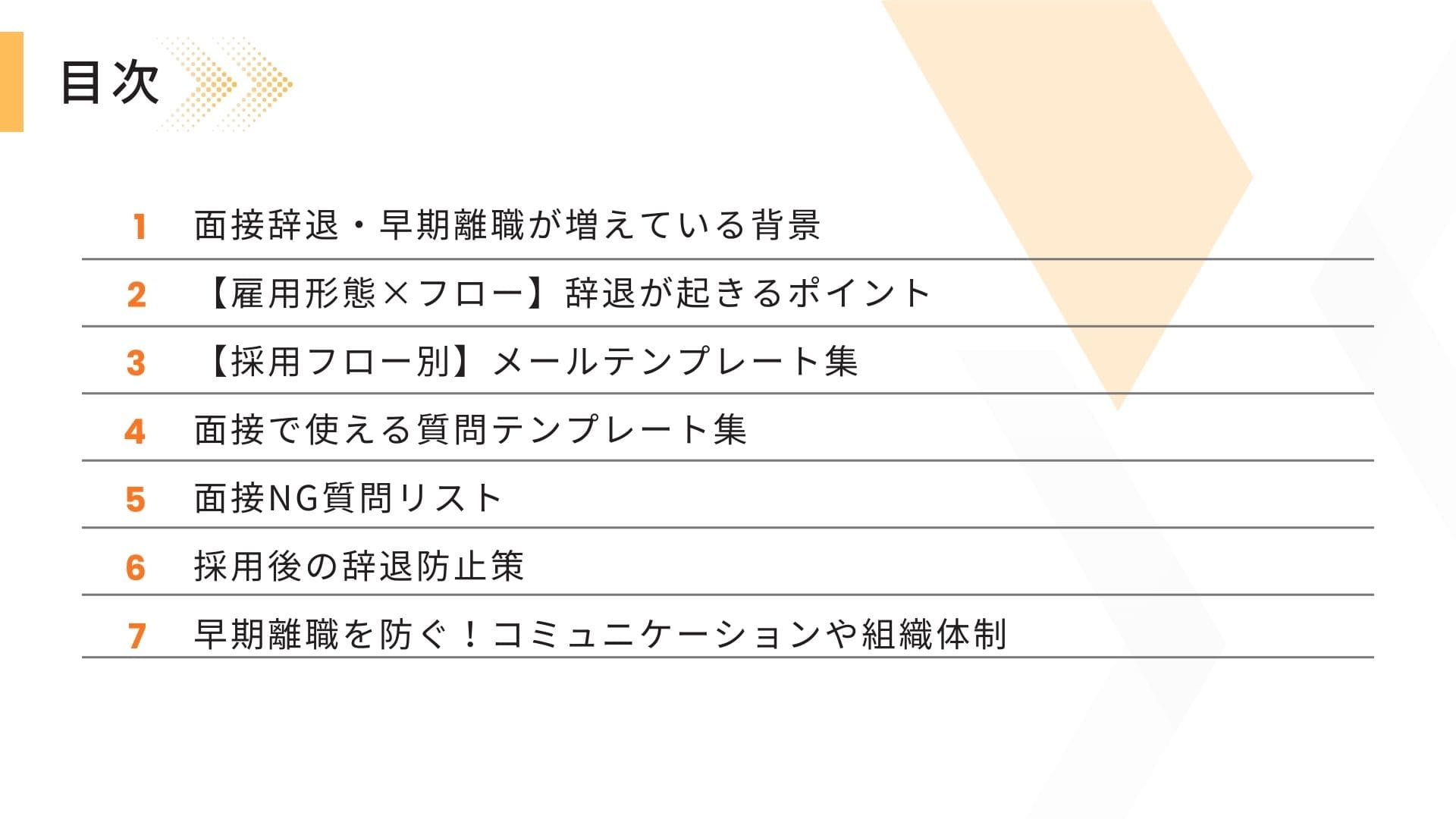 ※同業他社様・個人の方への資料提供はお断りさせていただくケースがございます。【資料について】とりあえずの応募が増える一方で、現場の負担が増していませんか?この資料では応募者を採用に繋げるための各フローのポイントや、面接質問集、応募者へメールテンプレートをまるっとガイド化しました!【こんな採用担当者様におすすめ】・応募~採用までのフローで応募者の辞退が多い。・面接の汎用的な質問項目を知りたい・入社後のフォローアップのコツが知りたい。