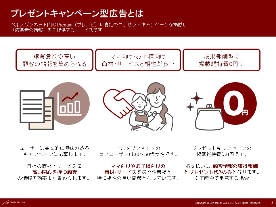 「プレゼントキャンペーン型広告」は、ベルメゾンネット内のコーナー『Prenavi(プレナビ)』に貴社のプレゼント企画を掲載し、応募者の情報を獲得できるプロモーションサービスです。