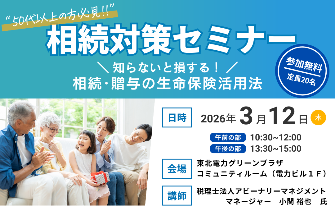 相続は誰にでも訪れる大切なライフイベントです。 本セミナーでは、相続の基本的な仕組みから、遺留分の考え方、エンディングノートの活用方法、生命保険を活用した相続税対策まで、幅広いテーマをわかりやすく解説します。