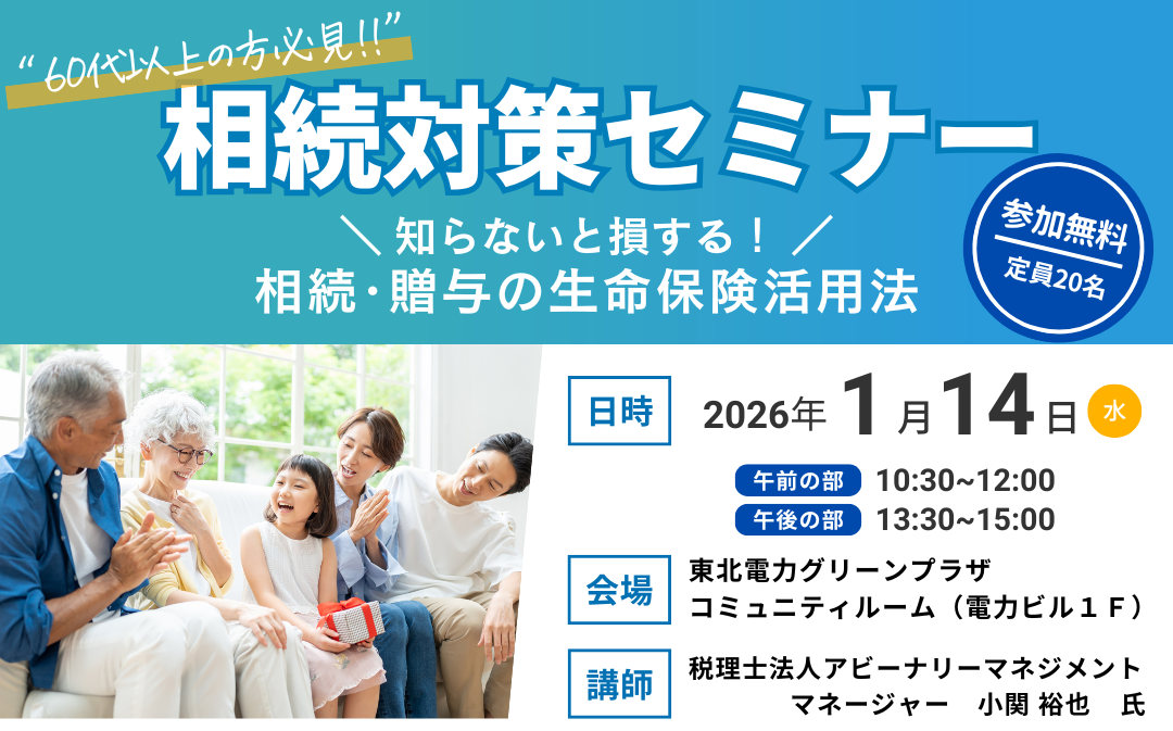 相続は誰にでも訪れる大切なライフイベントです。 本セミナーでは、相続の基本的な仕組みから、遺留分の考え方、エンディングノートの活用方法、生命保険を活用した相続税対策まで、幅広いテーマをわかりやすく解説します。