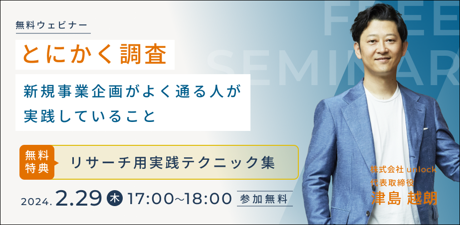 本ウェビナーでは、調査の初心者や苦手な方から、新規事業の提案を社内で通したい方、また、新規事業特有の調査方法や考え方を深堀りしたい方までご満足いただける内容です。