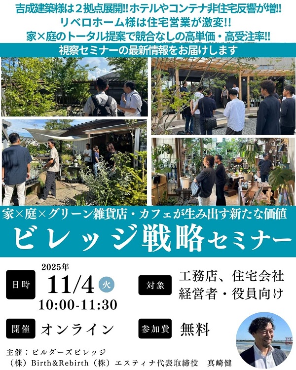 ![]() 「やっぱりリアルは強い」 契約率を伸ばす工務店の新しい集客戦略とは 「完成見学会に人が来ない…」 「契約率が伸びない…」 「反響が減っている…」 といった経営者の課題を解決しているのが、 いま全国で成果を上げている【ビレッジ戦略】です。 モデルハウスや社屋にカフェや雑貨店を併設し、 地域に自然と人が集まる“場”をつくることで、 集客・ブランド力・契約率を高める取り組みです。 実際に導入した工務店では、 「完成見学会の新規顧客の9割がショップ来店客に」 「自社の価値観を伝えやすくなり、契約率が上がった」 「まず“あの会社”を思い浮かべてもらえるようになった」 といった声が上がっています。 今回の無料オンラインセミナーでは、 ・工務店の集客強化の実例 ・SNS・デジタルとの効果的な連携方法 ・ブランド力と情緒的価値の高め方 ・成功工務店のマーケティング戦略と数値効果 ・ショップ立ち上げ費用や準備に必要なこと など、支援事例から見えた最新ノウハウを公開します。 これから「ビレッジ戦略」に取り組む方はもちろん、 すでに導入済みで課題を感じている方にも役立つ内容です。 ぜひこの機会にご参加ください。 |