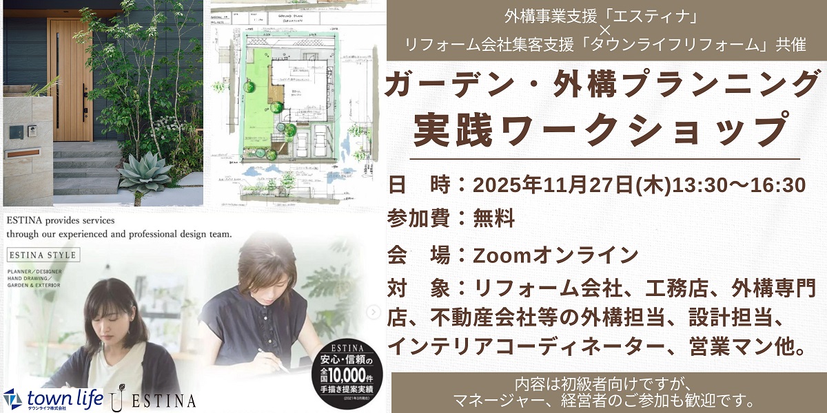 ・対象:外構担当、設計担当、インテリアコーディネーター、営業、設計マネージャーなど。初級者を主に想定。経営者、マネージャーの参加も歓迎です。