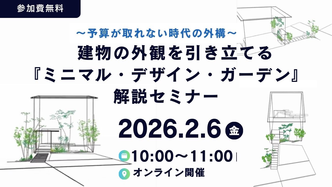 ![]() 『家を引き立てる外構を提案したいが、予算が取れない…』 ミニマル・デザイン・ガーデンは「外構に十分な予算はかけられないが、建物の外観にはこだわりたい」というニーズをお持ちの工務店様向けに生まれた、新しい外構のコンセプトです。 限られた外構予算でも、『建物の見た目』を最大限引き立てることに焦点を置いた外構プランニングのポイントとは? セミナーでは、私たちが提案する「ミニマル・デザイン」を基調とした外構デザインについて、最新の施工事例とデザインコードを紹介します。 外構強化に取り組む企業様はこの機会にぜひご参加ください。 |