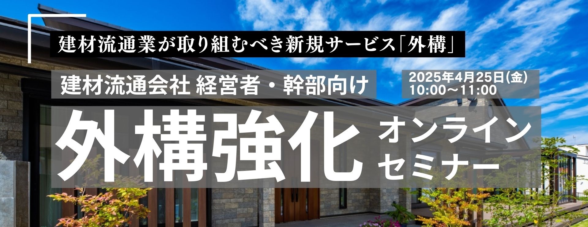 | 『建材流通業に求められる新たな挑戦』 新築着工棟数の減少の危機感から、新規事業に挑戦する建材流通会社が増えています。「外構」はBtoB、BtoCの両面で建材流通会社の強みを活かせることから注目されています。 セミナーでは建材流通会社による外構強化の成功事例や、新規参入時の課題と解決方法について具体的に紹介します。 ≪建材流通会社を取り巻く現状≫ ・新築着工棟数の減少 ・取引先工務店の経営悪化や社数の減少 ・大手建材流通会社による価格競争の激化 こうした外部環境の変化に適応するため、多くの建材流通会社が新たな事業領域への参入を模索しています。しかし、業界特有の保守的な企業風土が、新たな挑戦への障壁となっているケースも少なくありません。 『新たな領域への挑戦が始まっています』 そんな中、すでに、一部の建材流通会社は事業の多角化に踏み出しています。 ≪取り組みの一例≫ ・BtoCのリフォーム事業の強化 ・BtoB、BtoCの外構受注の拡大 ・BtoBでの工事受注強化 ・グリーン雑貨やペット用品を扱う小売業への進出 ・宿泊施設の経営 事業の「選択と集中」において何から着手すべきかは議論が分かれますが、まずは本業である建材流通業とのシナジーが期待できる分野から取り組むのが得策ではないでしょうか。 今回のセミナーで取り上げる「外構」は、まさに建材流通業と相性の良い事業領域です。 戸建て住宅から非住宅、ランドスケープまで外構プランニング1万3千件以上の実績を持つエスティナでは、CADから手描きまで対応する様々な外構ソリューションをご用意しております。 20年に渡り150社以上の企業の外構事業スタートアップから売り上げ拡大までっ支援してきた実績がございます。 当セミナーでは、建材流通会社が外構事業を強化するための具体的な事例や、直面する課題とその解決策について詳しく解説します。 情報収集だけのご参加も歓迎です。新規事業や事業テコ入れを検討されている方は、ぜひお気軽にご参加ください。 |