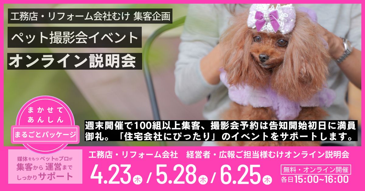 ![]() 「優良な見込み客をしっかり集める集客企画」の説明会 ペット × グリーン × マーケティングのプロフェッショナルチームが、御社商圏にエリアを絞って、事前の集客支援から当日の運営サポートまでパッケージした企画の説明会です。 ご予算・集客設計・営業戦略に合わせて、小さくテスト的に実施することも可能ですし、もちろんマルシェやワークショップと組み合わせて大きくひろげてみるなど、柔軟に対応可能です。 各社様のご要望にあわせてアレンジも可能な、ペットとの暮らし提案にテーマを絞ったイベントの説明会です。 |